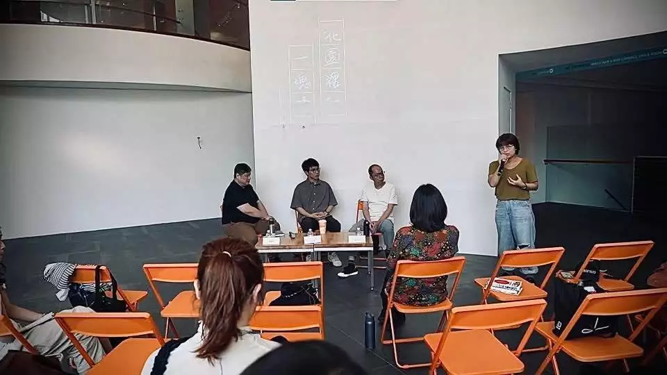 「花園裡的一塊磚」展覽講座「重探文獻與影像的檔案,重建楊逵的東海花園」(黃崇凱、汪正翔主講,黃建宏主持)(2025,關渡美術館)。圖片來源:國立臺北藝術大學關渡美術館。