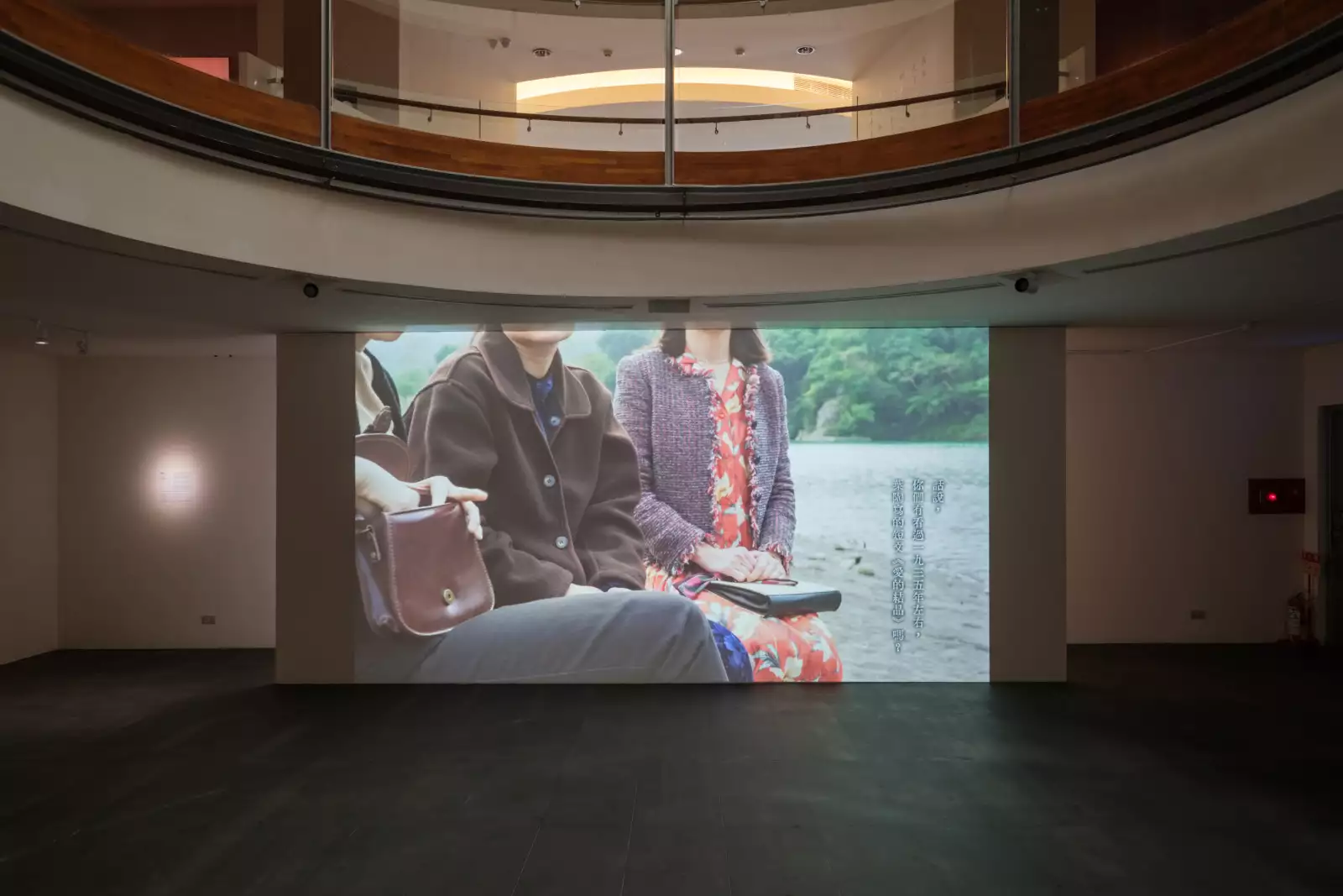 這件作品,座落在另外三位藝術家共同展間之外、獨立出來的另一展間裡:圓弧展牆圍繞而成的偌大空間,一排條凳木椅,被挑高的天窗所透進的日光灑亮,木椅前方則是一面大尺寸螢幕。
