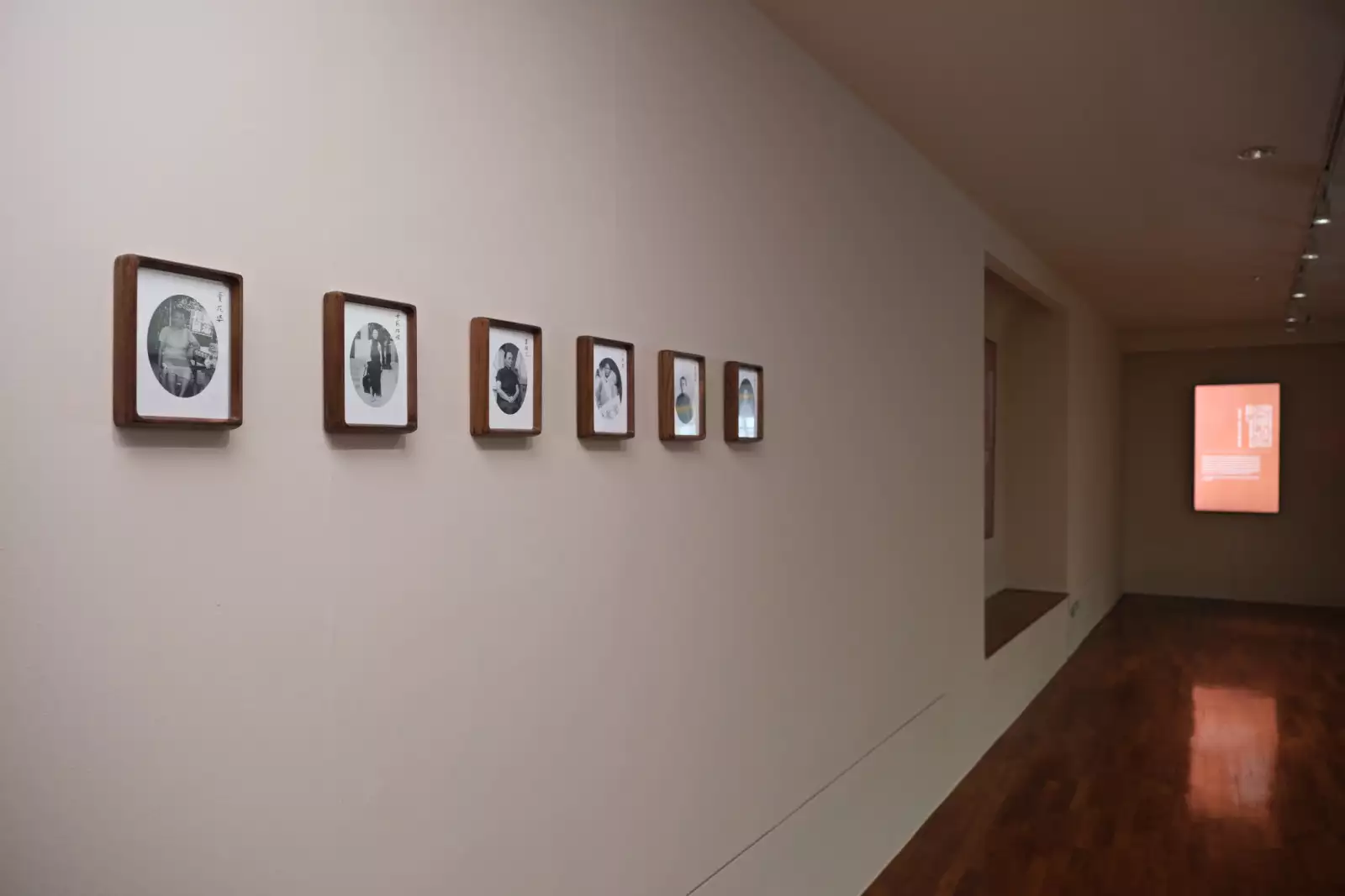 在劉紀彤的錄像作品中,長椅上比肩並排的三位女子,在影片裡幾乎從頭至尾「背對」觀眾;而樓上另一展間裡的展牆上,展示了多幅葉陶的「正面肖像照」,樓上樓下二者準確地互相對照,甚至還意外地遙遙對照了攝影師與觀念藝術家汪正翔在此一展覽裡的攝影裝置作品〈Missing Parts〉——靈感始自楊逵的「肖像照」。