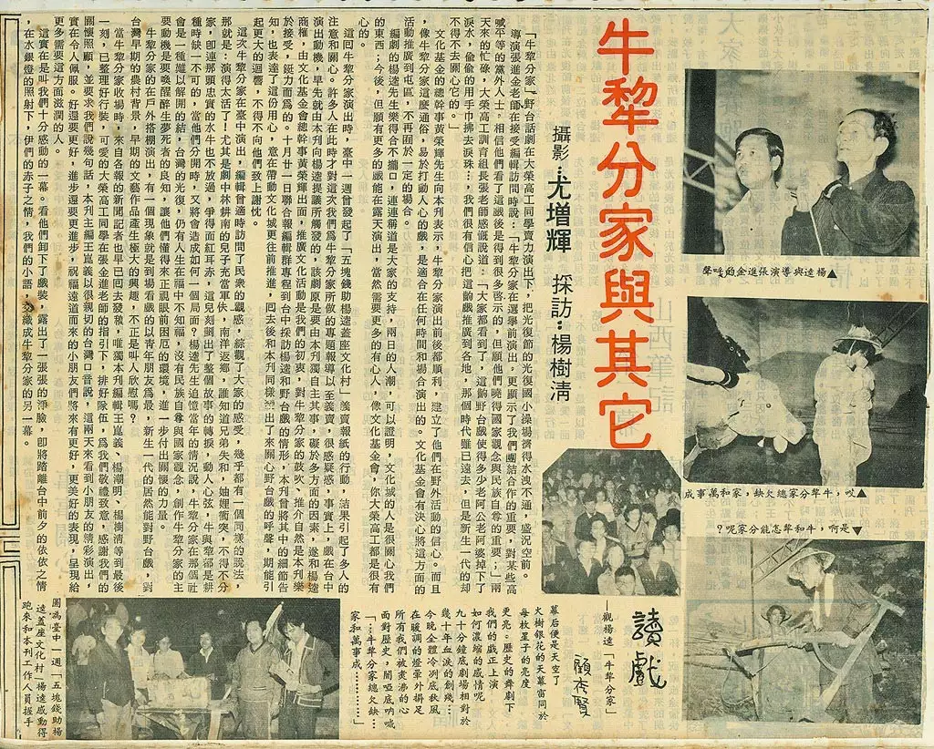 1980年10月《臺中一週》社區報,尤增輝、楊樹清圖文合作報導楊逵劇本改編的野台戲《牛犁分家》公演現場。(楊樹清提供)