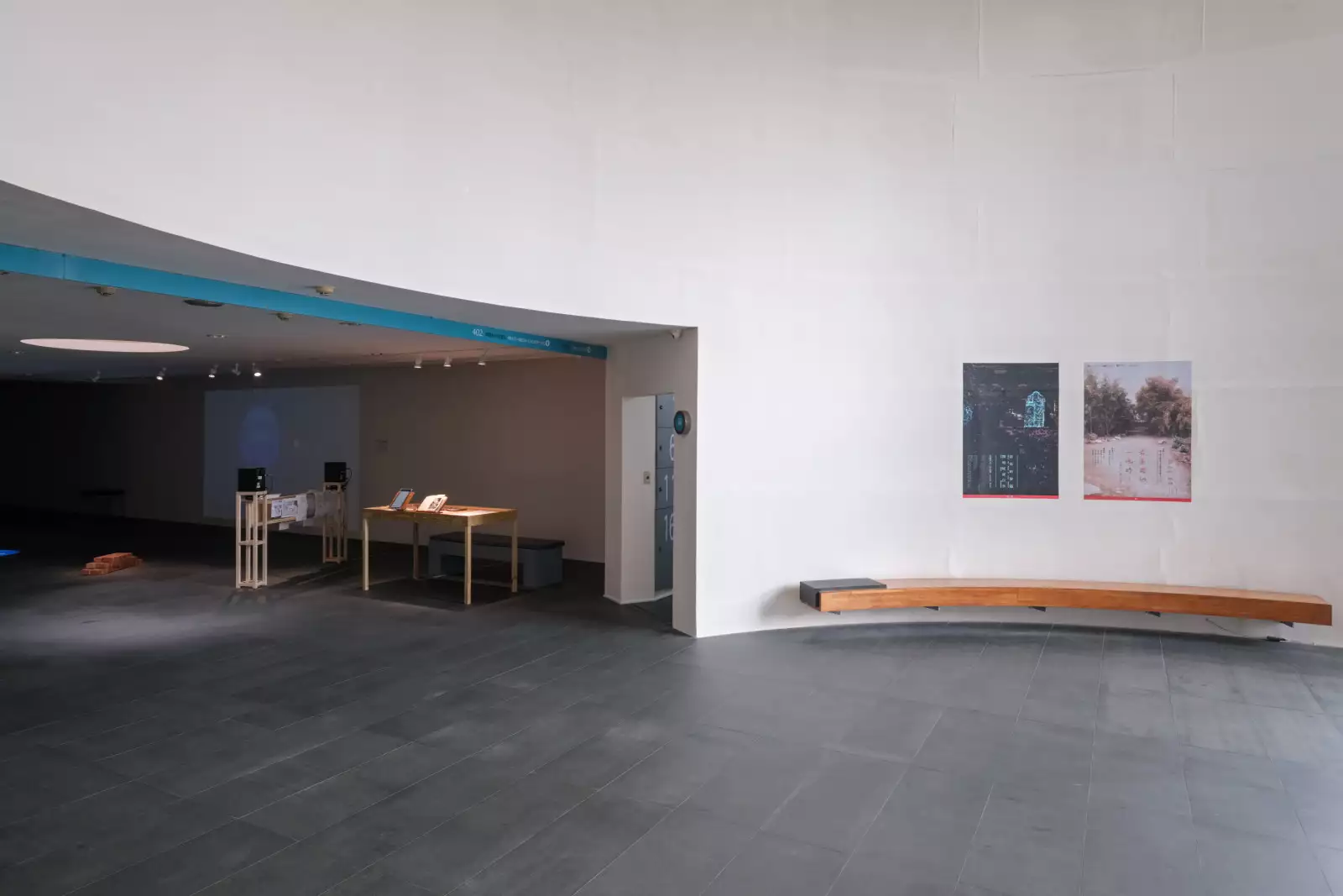 走進「花園裡的一塊磚」現場,關美館外頭仍在進行與圖書館廣場之間整體鋪面的重建,前一代的地磚已敲下,新一代的磚尚未鋪上,陣列搭組好的綱筋尚待灌漿。據聞,館長黃建宏也在此展開幕時對於「花園裡的一塊磚」在展題與展地物理空間的交纏上提到了他的聯想。在台灣,關美館也是唯一一座「由上往下」動線的美術館,此展所在地的四樓是大門所在,四樓相較展示面積最大的一樓展場,若扣掉大門入口區域,也極少有展覽想打開它在401圓形展場的透明大天井與402展場的三個小天井。多數時候,近入口的落地窗灑入的日光讓大多數展場規劃想要遮掉更多的自然光,暗空間成為四樓展場要服務入口大廳的稀缺品,這次展覽反而非常意外地,只在內側展域(汪正翔攝影裝置〈Missing Parts〉場域)遮光,黃大旺的聲音和榻榻米裝置組件〈電子音響讀劇《牛犁分家》〉則座落在過渡區的轉角。 經多次詢問,得知401展間多年前曾有打開天井的紀錄,而三個小天井則應是首次回應展覽並打開它的設計。李慈湄〈下一班靈魂列車開往生死文化園區〉的空間,一個小天井讓天光灑入,另一個小天井則嵌入聲音媒體——找來劇場演員鄭尹真配音諷刺演出。